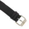 Silver-tone stainless steel case with a black leather strap. Fixed silver-tone stainless steel bezel. Black dial with silver-tone hands and Arabic numeral hour markers. Minute markers around the outer